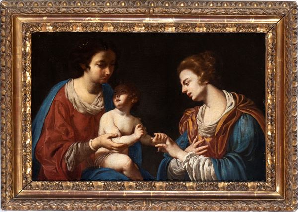 In this enchanting painting, undoubtedly intended for the private devotion of a refined Neapolitan gentleman, one immediately perceives all the most fertile moods of seventeenth-century Neapolitan painting at one of its happiest conjunctures, around the fifth decade of the century. Thus we recognize in this canvas elements akin to the art of the main protagonists of this lively phase, in which residual elements of Caravaggesque naturalism converge in a peculiar interpretation of classicism of Reni and the Emilian painting: from Stanzione to Pacecco, from Andrea Vaccaro to Cavallino. But the most stringent tangencies would be said to be those that link our painting to Onofrio Palumbo (the Virgin in both the Annunciation and the Adoration of the Shepherds, both in the church of Santa Maria della Salute in Naples) and even more so to Artemisia Gentileschi: think of the face of Bathsheba (Columbus Museum of Art, Ohio), the profile of the woman who is washing the basin kneeling in front of the child in the Birth of the Baptist in the Prado Museum in Madrid, or that of the Virgin in the Adoration of the Magi in Pozzuoli Cathedral. The comparison of our composition with the group of the two women and the child in the foreground in the Triumph of David in the State Art Museum of Florida in Sarasota is also interesting.