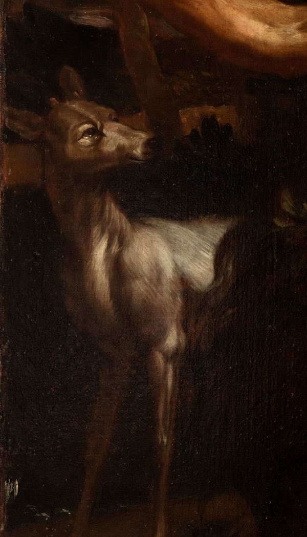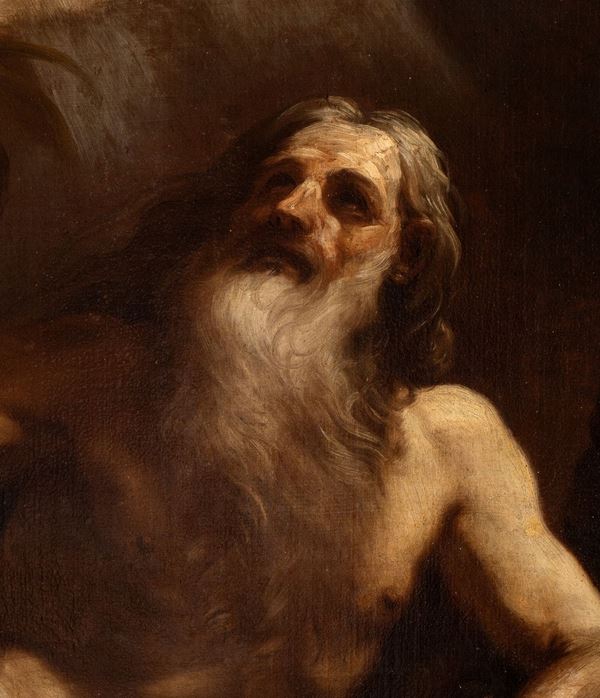 This intense and powerful depiction of Saint Onofrio, an anchorite who lived in Egypt in the 4th Century, shows a particularly rich and articulate figurative culture. Roman and Neapolitan elements are happily combined thanks to a very personal interpretation of models by Guercino, Mattia Preti, Mola and Luca Giordano, which push our painting towards Giacinto Brandi on the one hand, and towards Paolo De Matteis on the other. Although it is deemed appropriate here to leave the attribution question open, the painting's gloomy naturalism, governed by a refined mastery of drawing, seems to push the needle of the scales more towards the Roman area in the last decades of the 17th Century.