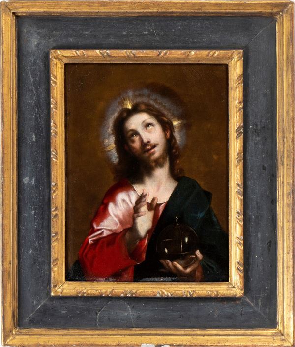 This remarkable representation of Christ as Salvator Mundi, blessing and holding the globe in his left hand, derives from the Christ of the Last Supper that Federico Barocci painted between 1590 and 1599 for the Cathedral of Urbino, recontextualised from a functional point of view for private devotion. Also from a technical and stylistic point of view, as well as from an iconographic and compositional one, our canvas displays a profound level of understanding and mimicry of Barocci's example, indicative of a hand particularly close to the great Urbino master, first that of Alessandro Vitali (Urbino, 1580-1630) as suggested in her expertise by Arabella Cifani.