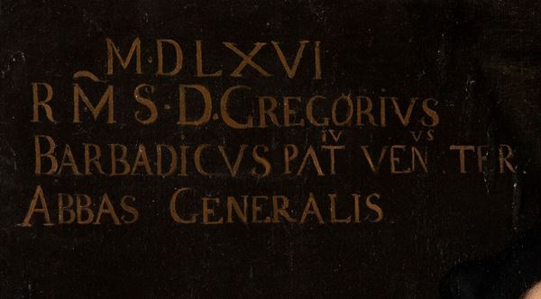 The painting bears a brush inscription in the top left-hand corner: 'MDLXVI / RMS. D. GREGORIUS / BARBADICUS PAT.iv VEN.us TER. / ABBAS GENERALIS".