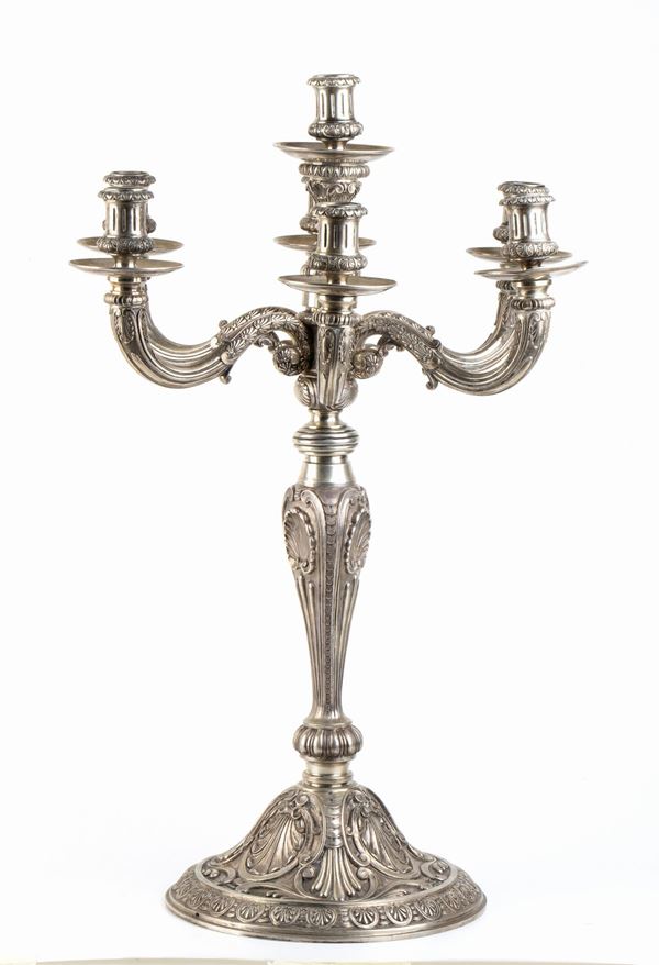 Stepped circular base decorated with foliate volutes and shells, tripartite shaft with cascades of doubloons and shells, from which depart six foliate arms with double volutes; bobeche decorated similarly to the base with wax-safe nozzle.