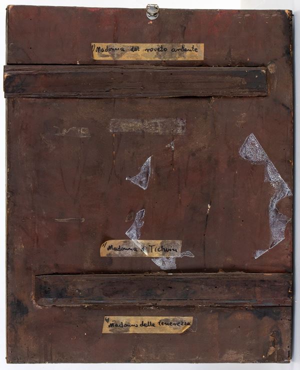 In the central part, various representations of the figure of the Mother of God: Our Lady of the Burning Bush, Our Lady of Tichvin, Our Lady of Tenderness and Our Lady of Smolensk; these panels are flanked on the sides by groups of saints.
