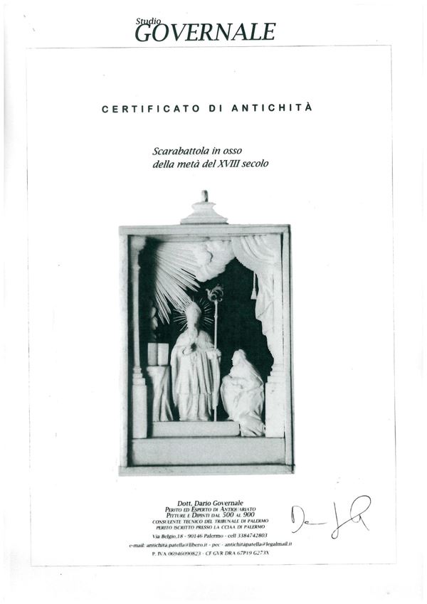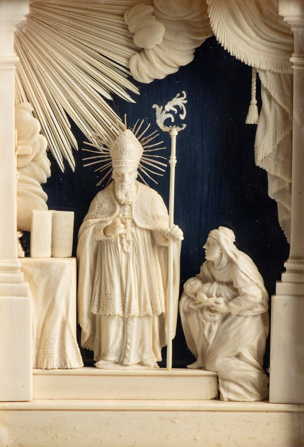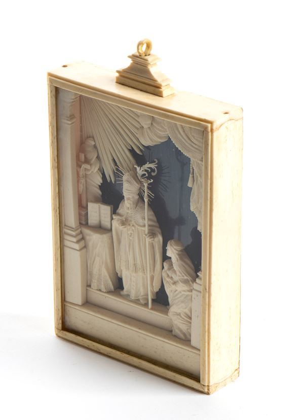 The characters of the sacred representation, micro-carved in the round from bone and depicting Saint Blaise with a devotee and a child, are enclosed in a rectangular bone case. The work is set in a traditional architectural backdrop; the standing figure of Saint Blaise in bishop's dress, with crosier and mitre, blessing a woman kneeling at his feet with a child in her arms is placed in the centre of the representation, while to his right is an altar with a crucified Christ and a sacred text.