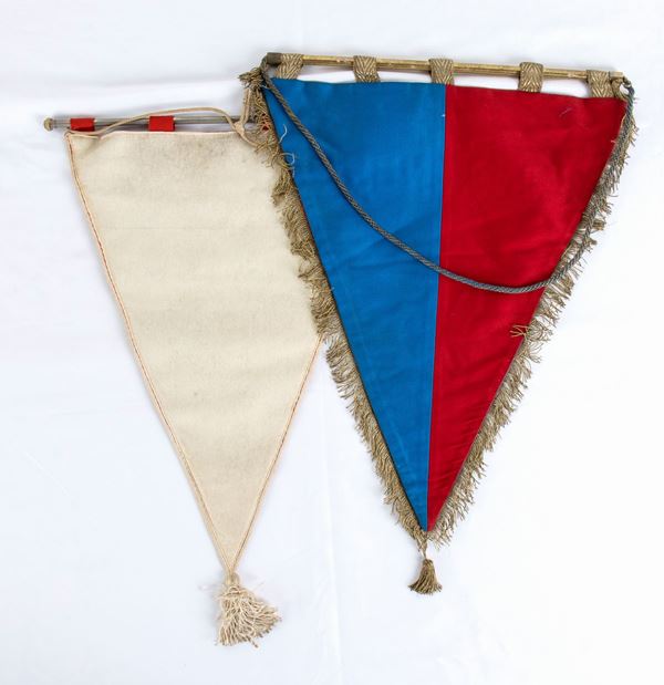 Lot of two football pennants, A.S. F.A. DORIA 1947 commemorative for the sporting event of 19-20-21 JUNE 1964 in Rome, in red cotton and white felt applications, and pennant of the U.P. NARNESE in red and blue cotton, with applied felt griffin, tinsel fringe. Complete with metal rods. Very good condition