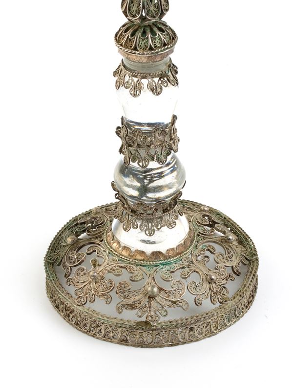 the artwork has a circular base made entirely of silver filigree, above which is a curved rock crystal block, above which is a knot supporting the cross also made of filigree