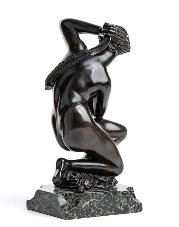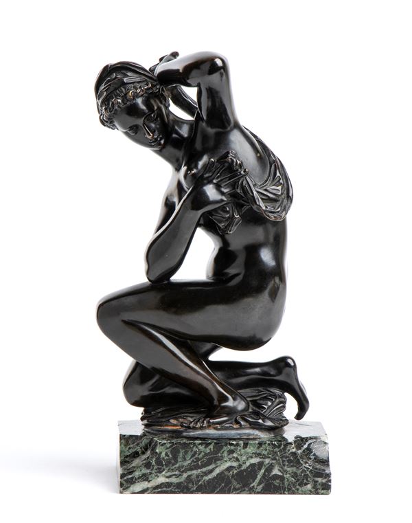This bronze reproduces a famous "crouching" Venus by Giambologna. The original bronze is preserved in the Bargello National Museum, Florence (inv.62 B). Many bronze derivations were produced up to the 18th century and even later.