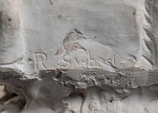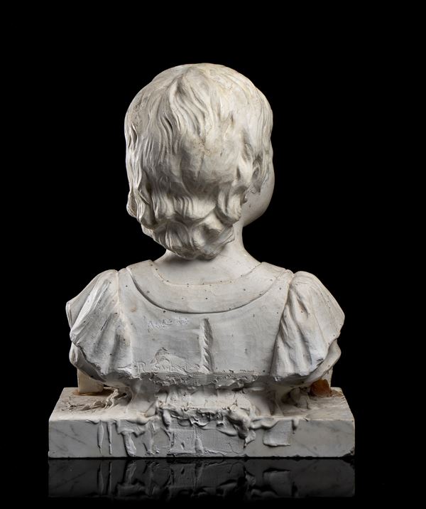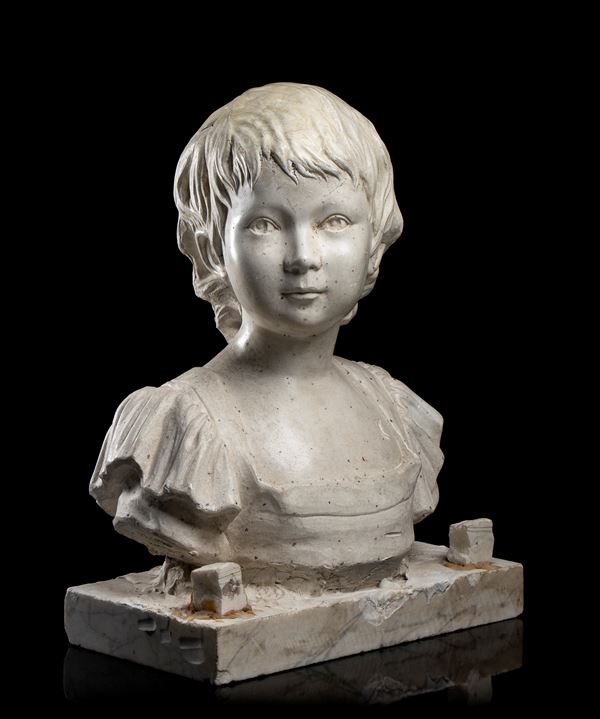 This interesting object represents the intermediate phase between the plaster sketch and the marble creation of a sculpture. The portrait was covered with dots so it can be translated into marble. Two pieces of marble are fixed on a surface to indicate the material of the final piece.