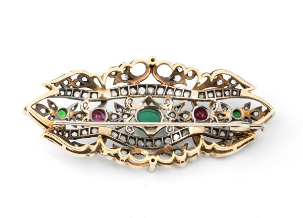 in the shape of an openwork lozenge, with rose-cut diamond ribbons, embellished with two rubies and glass paste.
