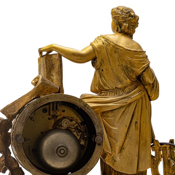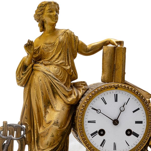 with white marble base, cylindrical body with the muse Calliope in gilded bronze. Machine with round white enamel dial with Roman numerals and two holes for winding and striking. Pendulum regulator with bronze bell for the chimes. Machine signed Japy Frerees 1855. This watch manufacturer was founded in the 1770s by Frederic Japy Beaucourt and remained active until the end of the 1770s. Running car.