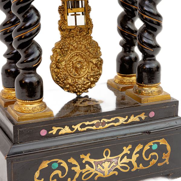 in ebonized wood, with four twisted columns and brass finishes. Machine with steel plate suspension and pendulum regulator. White enamel dial with circular Roman numerals and two holes for the hours and the chime. Untested watch.
