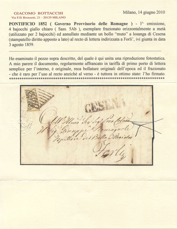 03.08.1859 - Letter from Cesena to Forlì franked for 2 baj. with a 4 baj papal stamp in light yellow n.5Ab split in half diagonally, thus paying the first postage rate for the interior. The whole, which in itself is of great value, is enhanced by the use of the split on the recto instead of the verso. Cat. 13,000 (A) (Cert. Bottacchi, Emilio Diena, Alberto Diena)