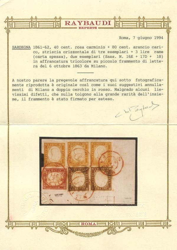 06.10.1863 - Extraordinary franking of 8.8 Lire composed of a 40 cent. carmine red n.16D + a strip of three of the 80 cent. deep orange n.17D + two values of the 3 Lire copper n.18, preserved on a fragment of a letter. Only the 80 cent. strip has a slight defect in the margins, the others are all well margined.