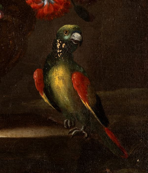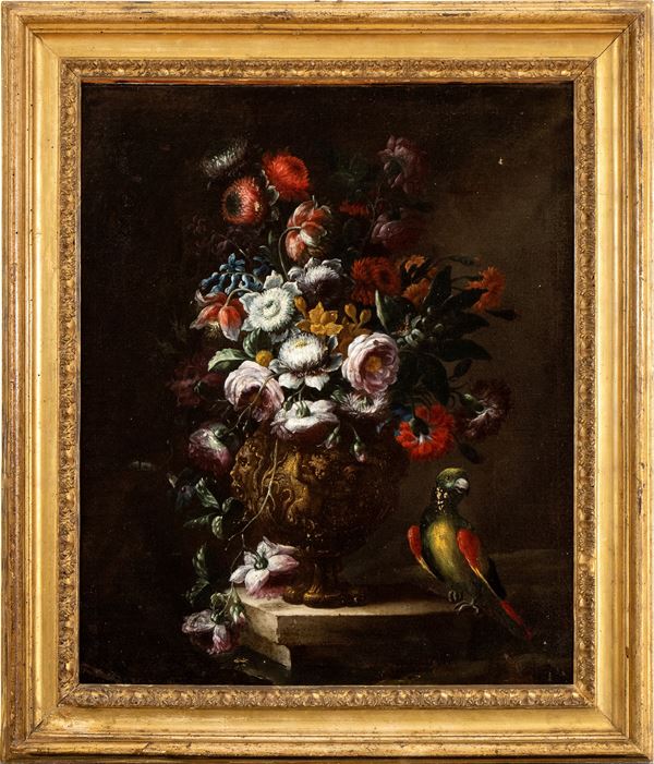 Still life of flowers and metal vase decorated with parrot