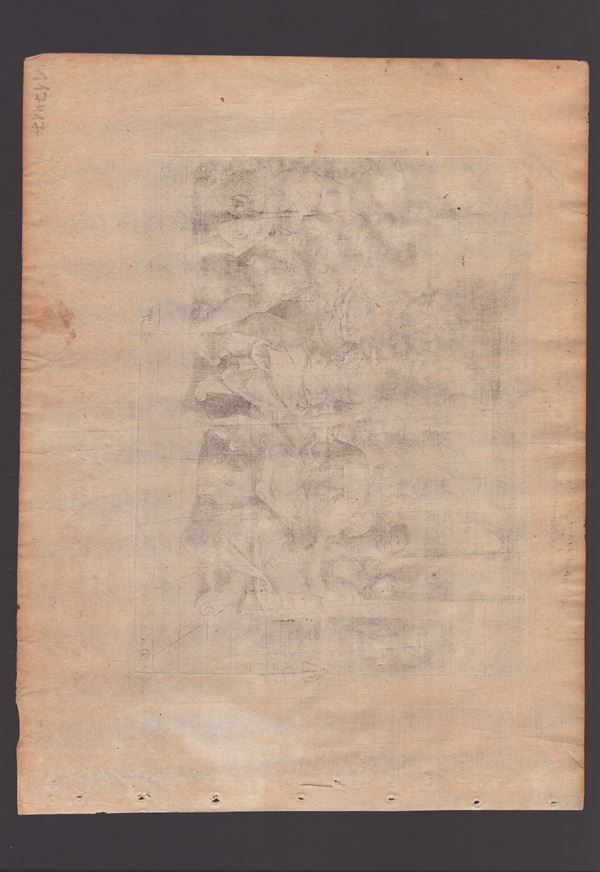 Very fine impression with plate tone, printed on thin laid paper with watermark. At the top, an ancient handwritten inscription in ink. Binding holes along the left side. In very good condition.
