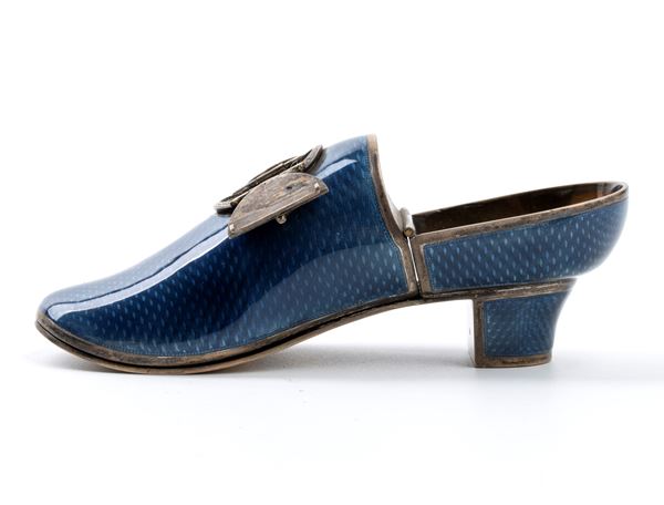 Shoe-shaped silver case with guilloché enamels in shades of blue; the top features two flaps concealing the white enamel dial with Arabic numerals and black hour markers. Time setting and winding with a key.