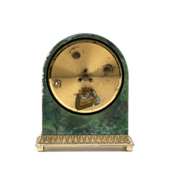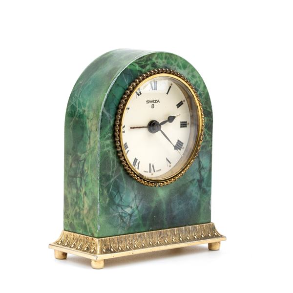 Gilded metal case and faux marble in shades of green, white enamel dial with Roman numerals and black hour markers, bearing the inscriptions "Swiza - 8 - Swiss made".