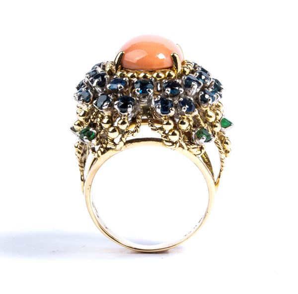18k yellow gold, set with oval cabochon cut cerasuolo coral (corallium elatius), embellished with round shaped blue sapphires and emeralds.