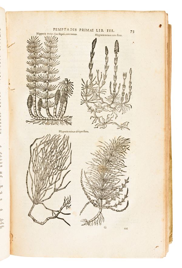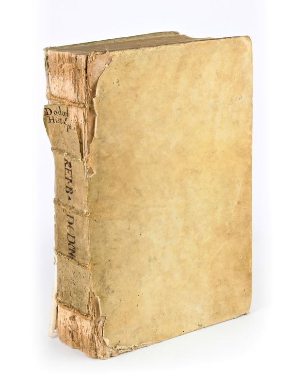 Partially colored chalcographic frontispiece. In-folio, mm. 360x 235, pp. (16), 872, (66). Contemporary binding in full ancient parchment. Defects on the spine, partially detached covers. Woodworm damage on the spine and on the internal margin of the text, mainly affecting the last 7 leaves (Index rerum and colophon), with missing and lost text. Printer's mark on the colophon, more than 1300 woodcut illustrations of plants.