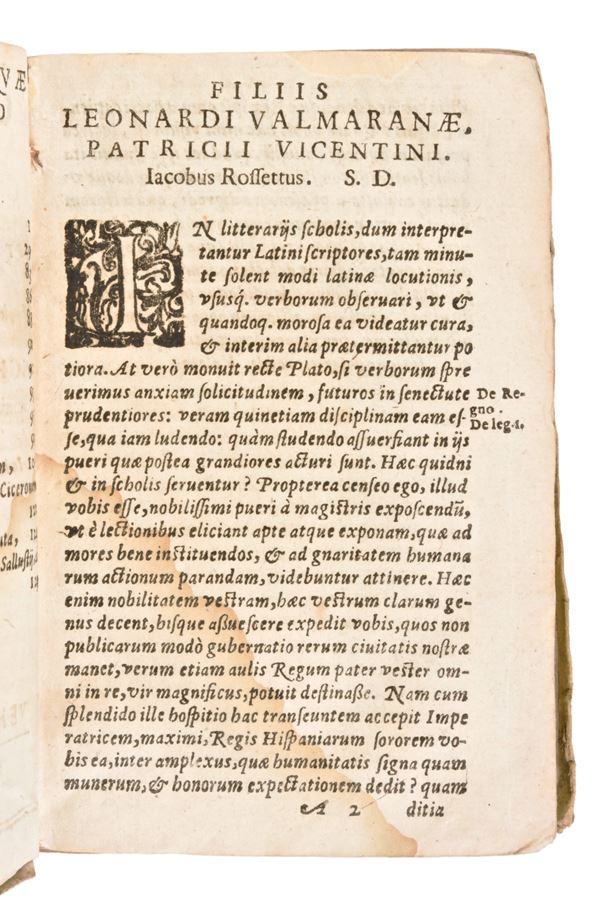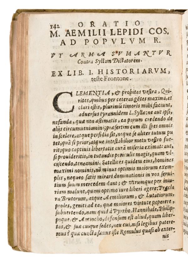 Format in-8ยฐ, mm. 145x110, pp. (16), Contemporary hardback with handwritten titles on the spine. Ancient notes and drawings on the covers. Framed title page with woodcut printer's device. Handwritten notes in ancient ink on the flyleaves, missing front cover leaf. Slight stain on the lower edge of the leaves. Front hinge partially detached. Latin text, Roman italics.