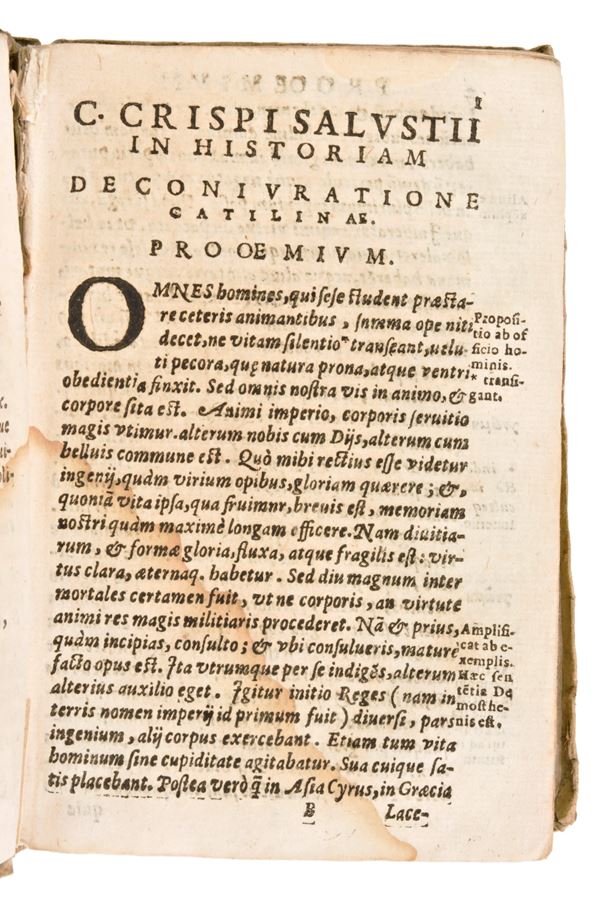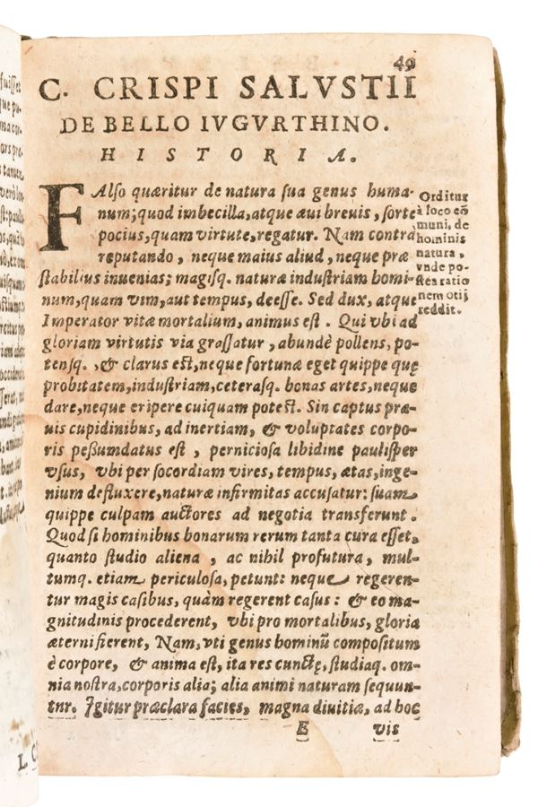 Seventeenth century printed in Venice in 1625 for Petrum Milicum, a collection of the works of the ancient Roman historiographer Gaius Sallustius Crispus, commented by the humanist Aldus Manutius the Younger (1547-1597). Contains: De Catilinae coniuratione, Bellum Iugurthinum fragmenta and Fragments of the Historiarum. Finally, the index of memorable things.
