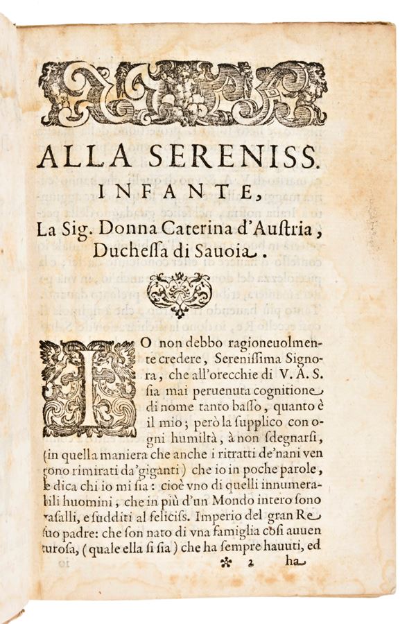 Declaration of the Psalms of David, made by the RPF Francesco Panigarola, to the Most Serene Infante, the Duchess of Savoy. In Venice in 1587 for Bernardo Giunti. Work of the bishop Francesco Panigarola (1548-1594). Coat of arms engraved on the frontispiece, headers and initials in the text. There is 1 engraved plate outside the text depicting King David in prayer. Format in-8ยฐ, pp. (8), 501, (3). Contemporary binding in full old parchment with handwritten titles on the spine. There is a tear in the lower corner with small loss of text on the Aa1 leaf (Psalms 369-370). Small losses on the covers. Sporadic foxing and browning.