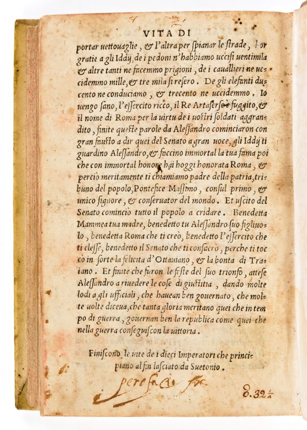 Cinquecentina printed in Venice in 1544 for Michele Tramezzino. Work of the Spanish writer Antonio de Guevara (1480-1545), with the intent of chronologically continuing the historiographical work of Suetonius (Lives of the Caesars) by adding ten other Roman emperors (Trajan, Hadrian, Antoninus Pius, Commodus, Pertinax, Julian, Severus, Bassianus, Heliogabalus, Alexander Severus). Text translated into Italian by Mambrino Roseo from Fabriano (16th century).