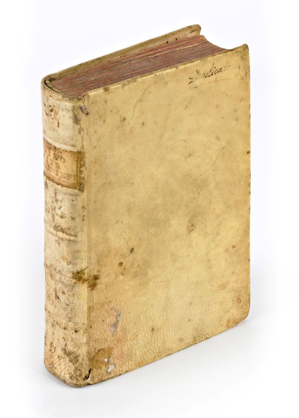 Format in-8ยฐ, mm. 155x105, cc. (8), 231. Copy missing the colophon (last leaf, Ff8). Later binding (17th or 19th century) in full old parchment with gold titles on the spine. Spray cuts. Large typographic device on the title page, with woodcut vignette in an illustrated frame: Sibilla. Clear text, roman italic. Slight stain on the lower margin of the first 4 leaves and last 3.