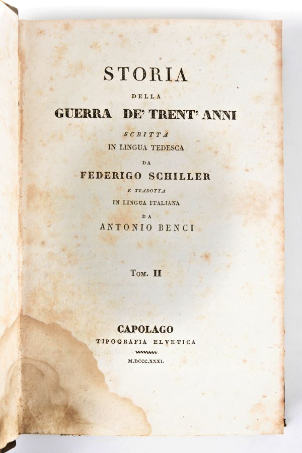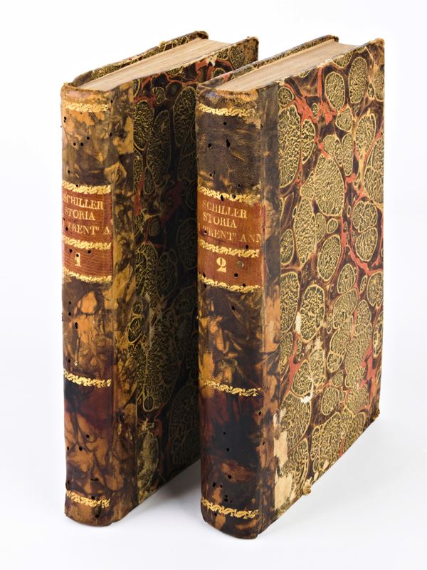 Format in-8ยฐ, (4), 312 / (4), 357, (1). Contemporary binding (19th century) in half leather, gold titles on the spine. Sporadic foxing and light water stain. Old edition from 1831 complete in 2 volumes, printed in Capolago for Tip. Elvetica. Work of the German historian Friederich Schiller (1759-1805). Schiller saw in this war (1618-1648) the first conflict on a European level that ultimately, in the Peace of Westphalia, brought devastated Europe to a new awareness: that the states of Europe constituted a community and that a war like this, which had halved the population of central Europe, must never happen again. Schiller when he wrote the work did not yet know the devastating consequences that the French Revolution would have for the European states, not to mention the terrible wars of the twentieth century. But this certainly does not diminish the value of this voluminous research.