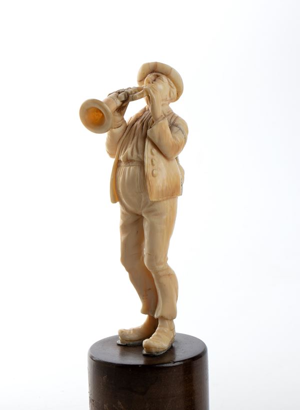 resting on ebonised wood plinth bases and intent on playing various musical instruments: a man playing a trumpet, with a dynamic pose conveying the energy of the moment; a bassoon, in a slightly inclined position; a large tuba, rich in detail, evident in both instrument and clothing; another bassoon with a refined posture and a classical attitude, holding a large cylinder; a pipe, with a slightly relaxed pose, completing the variety of the group. The figures are reminiscent of the figurative repertoire typical of Nordic production, in particular German and Austrian, and wear detailed 19th century clothing: with well-tailored hats, jackets and trousers, typical of the period.