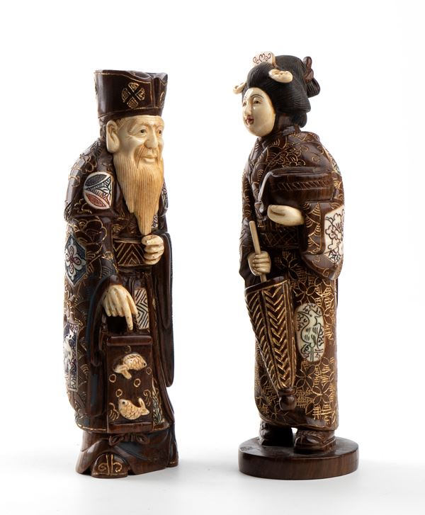 A pair of Japanese bone okimono, Meiji Period, 1868-1912