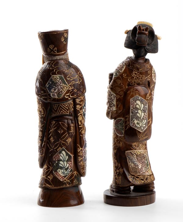 The woman is depicted with a delicate and graceful expression, emphasised by her traditional hair, gathered with typical ornaments; she also has her face, hands, hair clips and some elements on her dress made of bone. She wears a kimono characterised by complex geometric and naturalistic patterns. She elegantly holds a parasol, a symbol of refinement and traditional femininity. Underneath she bears a signature in red lacquer.