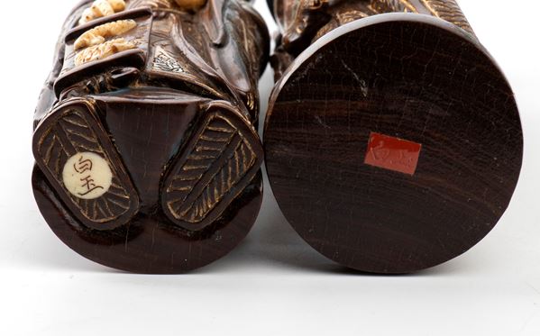 The elderly man, probably a sage, has a serene and friendly expression with finely detailed facial features made of bone, as well as his hands and some elements on his robe, richly decorated with animal figures and geometric elements. He wears a traditional headdress and clothes richly decorated with decorative carvings. His long beard and staff accentuate his wisdom and advanced age. Below is signed with an engraving on a bone slab.