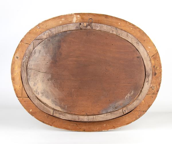 with a gilded wood oval theca framing a polychrome wax relief depicting the Nativity. The composition depicts the Madonna and St. Joseph with the baby Jesus in the centre being gently shown to the Archangel Gabriel, with a chorus of cherubs around him.