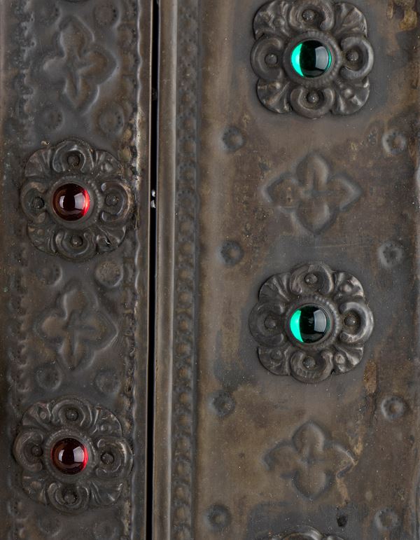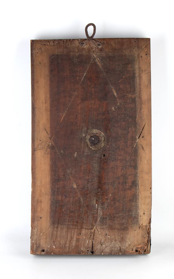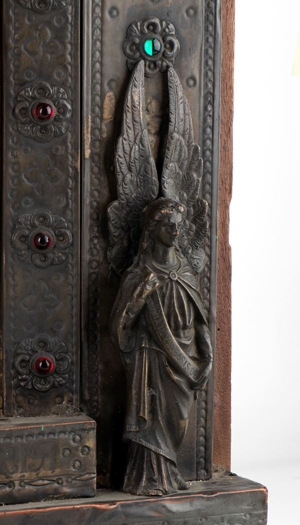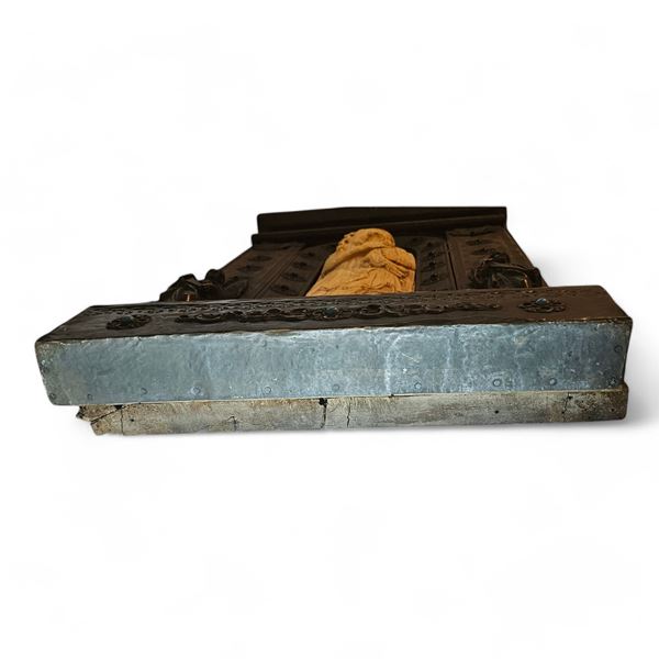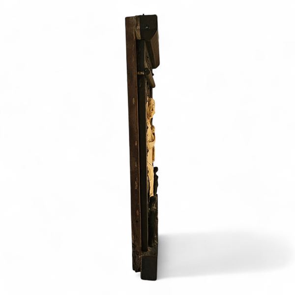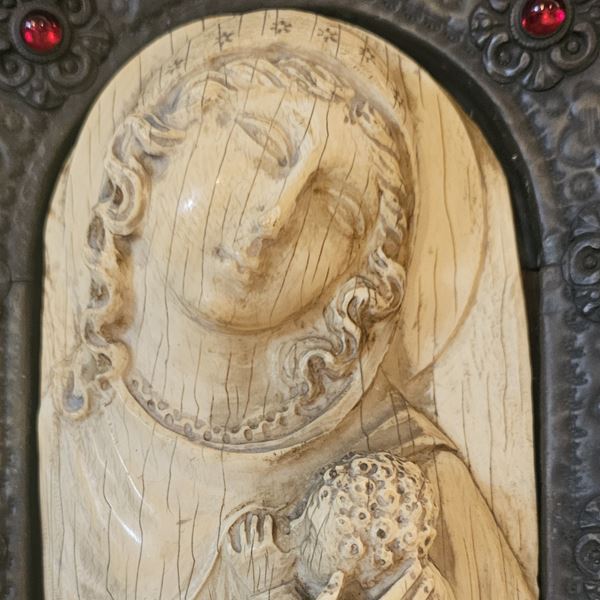 Placed within a wooden shrine, possibly from a later period, covered in metal foil and decorated with glass pastes in shades of green, red and blue, it is a 15th-17th century work of sacred art. Ivory represents purity and allows for delicate details, while Mary is depicted with a sweet and maternal expression with her face with fine features, framed by neat hair held back by the tiara that supports the veil. The Child Jesus is portrayed feeding at the breast, with the childlike gesture of the left hand resting on his mother's breast as a symbol of humanity and divinity. The glass paste on the support adds sacredness, representing the connection between the divine and the earthly, with Mary as intercessor between heaven and earth.