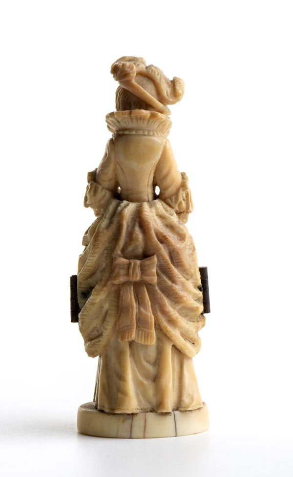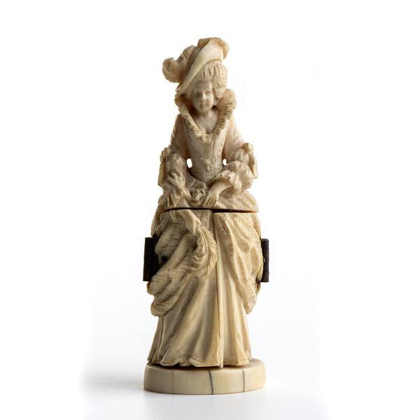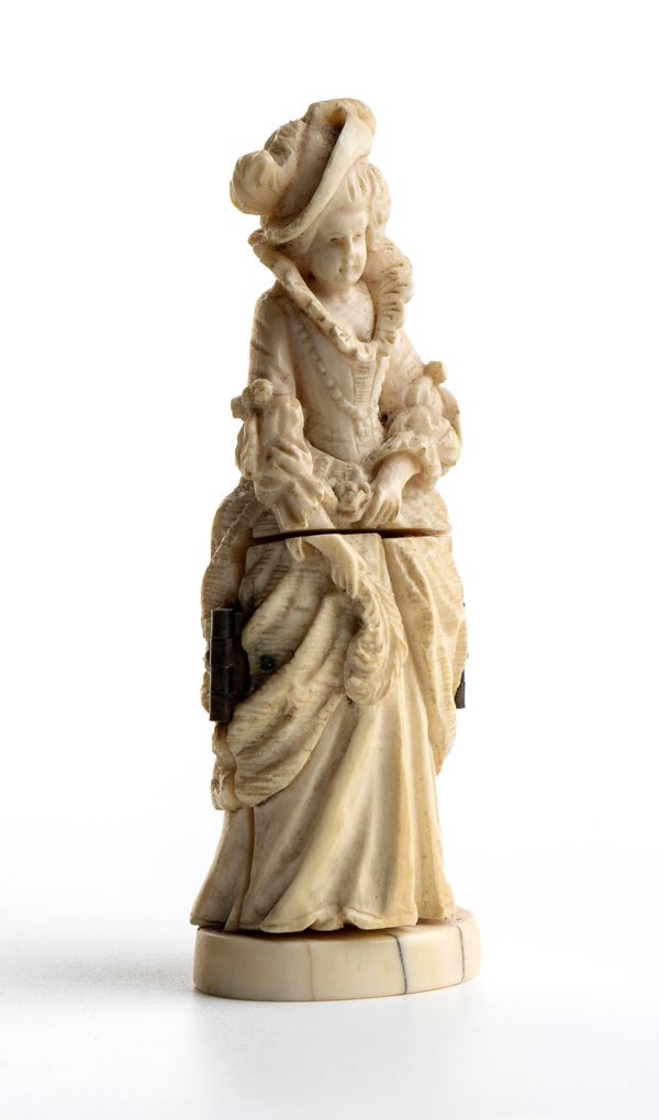 elephant ivory openable sculpture (Elephas maximus Linnaeus, 1758 or Loxodonta africana Blumenbach, 1797) carved in the round to depict a lady in a period dress resembling Emma Lady Hamilton (Neston, 26 April 1765 - Calais, 16 January 1815), an English adventuress remembered for being the mistress of Admiral Horatio Nelson; on the inside, scenes from her life.