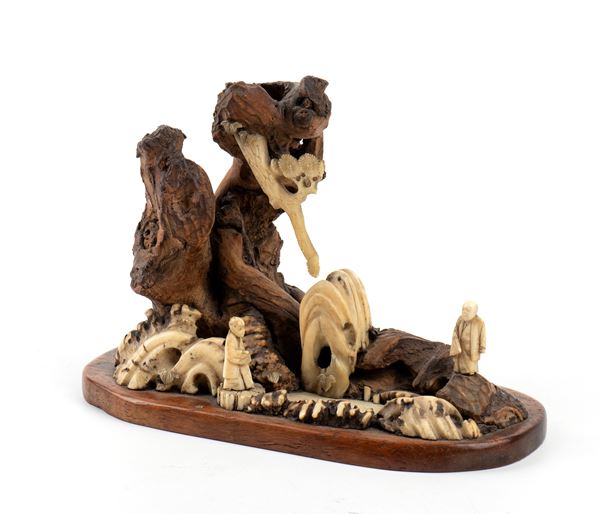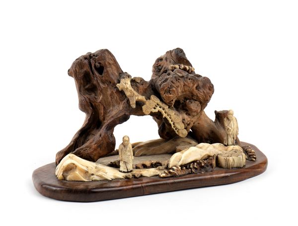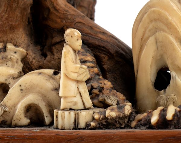 The compositions are developed on two wooden bases, which serve as support and frame. The wood is used to represent twisted rocks and trees, suggesting a mountain or hillside scene, while carved bone is used to create human figures, natural elements and scenic details. On both pieces are small human figures carved in bone, depicted in static and meditative poses, probably sages or elders or wayfarers.