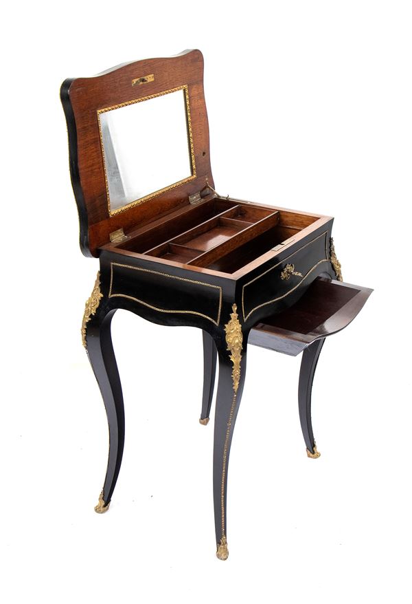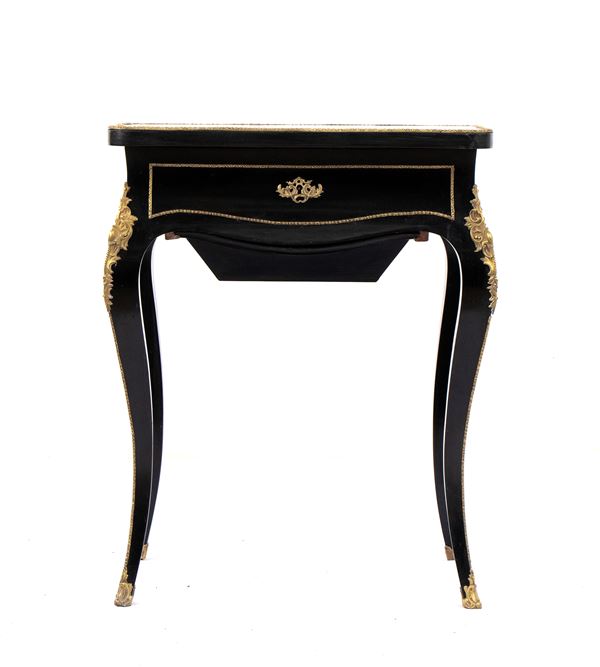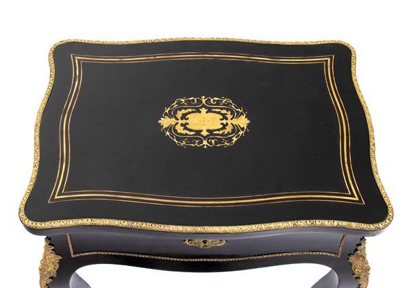 Of rectangular ribbed form, ebonized wood with gilt bronze appliqués, top inlaid in brass with floral motifs.