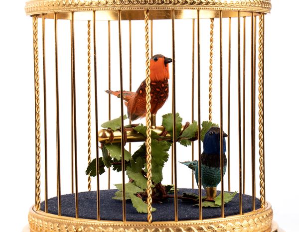 Metal cage and casing containing two small dancing parrots with colorful plumage. The feathers are authentic, repainted, and the birds are attached to the bases with a brass stand and assembled to the mechanism hidden by a blue velvet-covered top. Underneath is the crank that winds the mechanism and the button that starts the music box.