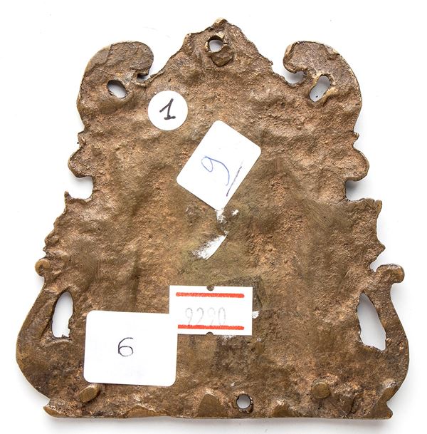 Trapezoidal bronze plaque, light brown patina, two holes in the center at the bottom and top; mm 100.2 x 98.1; gr 98.6.