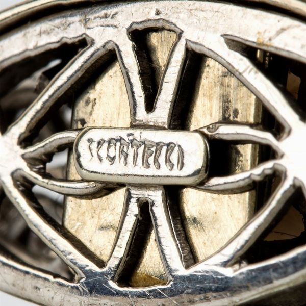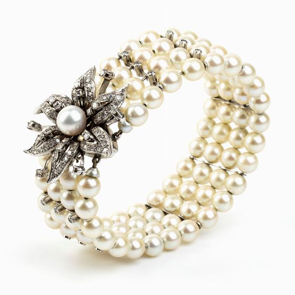 a quattro fili di perle coltivate d'acqua salata trattenute da distanziali a barretta con diamanti. Fermezza realizzata in oro bianco raffigurante un fiore con perla centrale e petali impreziositi da diamanti. Firmato "SCORTECCI". Diamanti di forma rotonda, taglio huit-huit, 2.70 ct circa, G-H, VVS-SI.