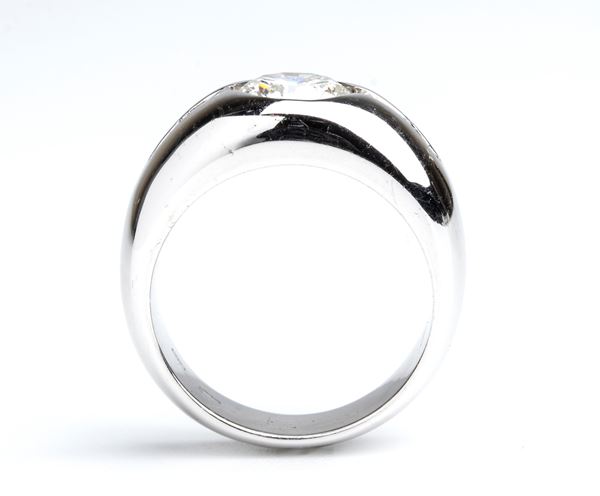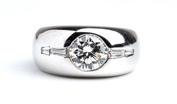 in oro bianco 18k, modellato come una fascia, incastonato con diamante centrale affiancato da due coppie di diamanti taglio tapered.