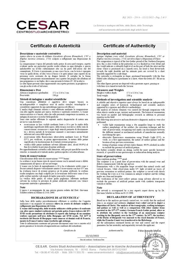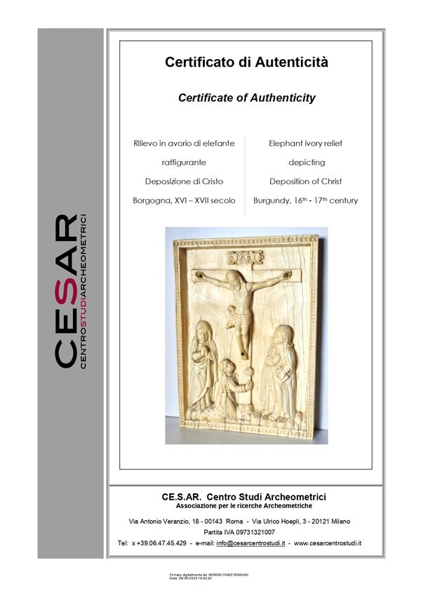 In avorio di elefante (Loxodonta africana Blumenbach, 1797 o Elephas maximus Linnaeus, 1758) finemente scolpito ad alto rilievo a raffigurare la Crocifissione di Cristo.