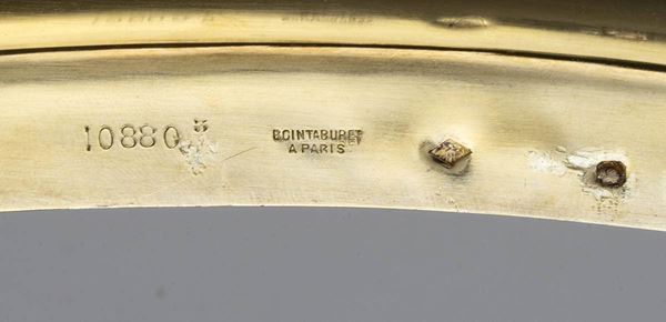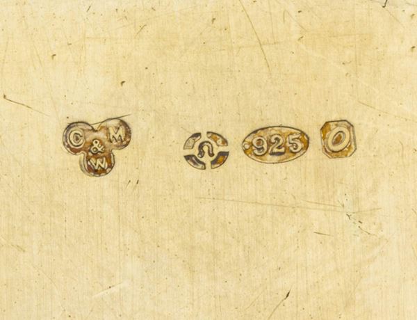 di forma mistilinea con bordi decorati con foglie d'alloro. Punzonati con marchi francesi post 1838 in uso a Parigi per l'argento 950/1000, argentieri Georges Boin and Emile Taburet.