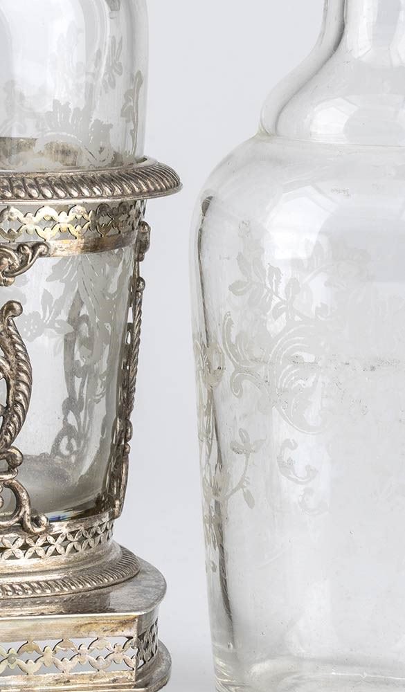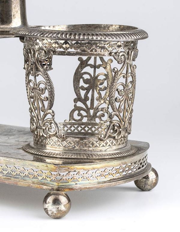 di forma sagomata, poggiante su quattro piedini fogliati; presa centrale con due ampolle laterali in vetro. Punzonata con marchi non identificati.