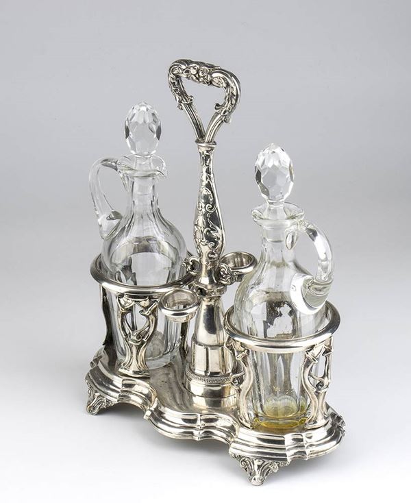 di forma sagomata, poggiante su quattro piedini fogliati; presa centrale con due ampolle laterali in vetro. Argento 800/1000, punzonata con i marchi in uso a Novara, Regno di Sardegna dal 1824 al 1872 e con il marchio dell'argentiere Canetti Federico opeante a Vercelli a partire dal 1824.