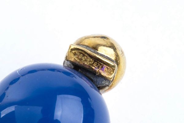 oro giallo 18k, con linea di sfere di calcedonio e corniola.