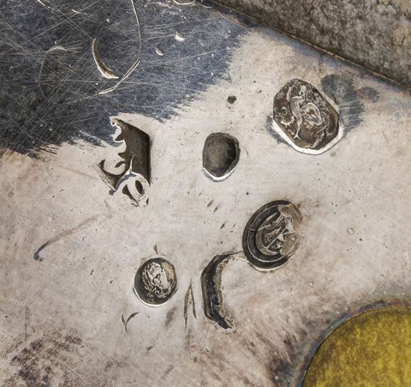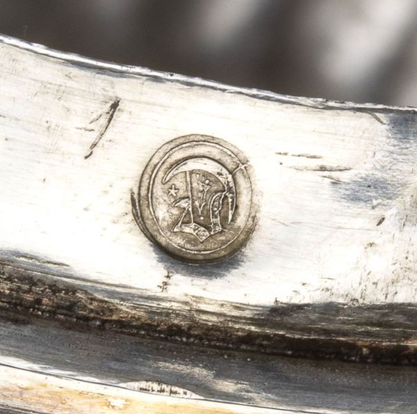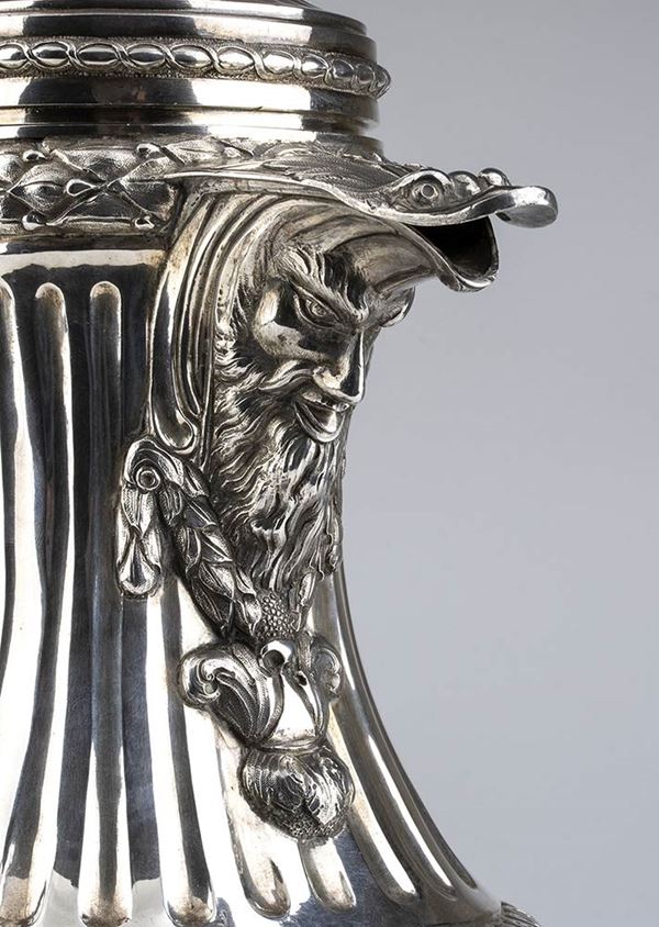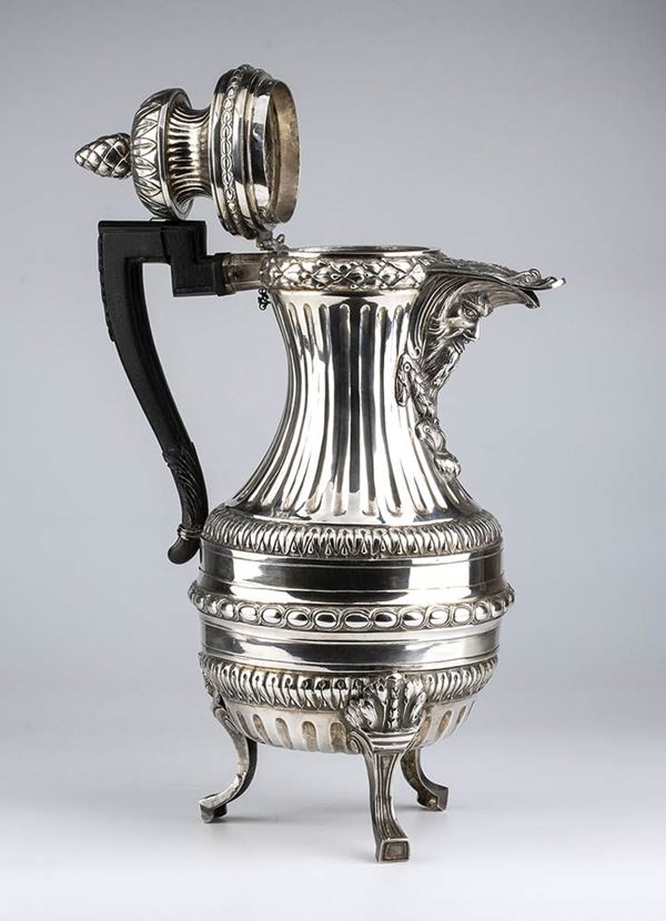 corpo circolare poggiante su tre piedini stilizzati, collo rastremato con scanalature verticali e versatoio con testa di satiro; coperchio scanalato con cimatura a pugna. Argento 800/1000, punzonata con i marchi in uso nel dipartimenti francesi (probabilmenterù nr 34, Indre-Chateauroux) tra il 1798 ed il 1809 e con il marchio di recensione del 1809.