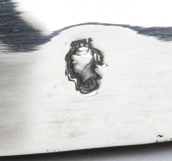 base circolare con fusto scanalato dal quale si dipartono tre braccia a forma di pesce. Argento 800/1000 punzonato con i marchi in uso in Italia dal 1872 al 1935,