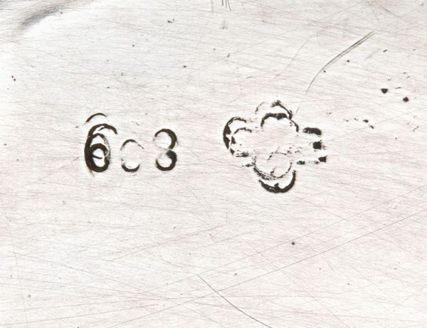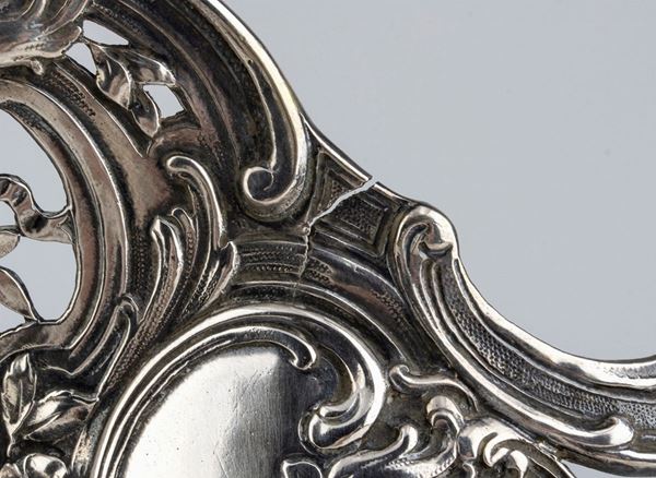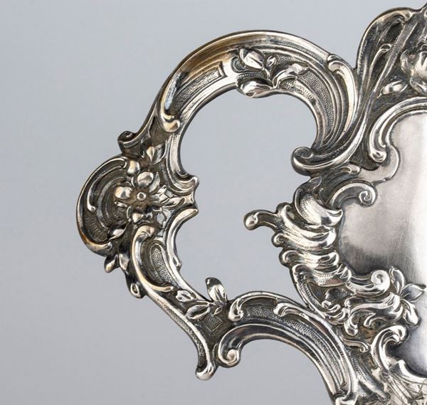 di forma ovale sagomata con manici laterali, interamente decorato con putti, fiori e volute floreali. Argento 800/1000, punzonato "800"