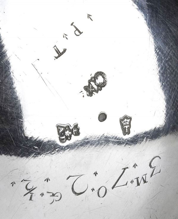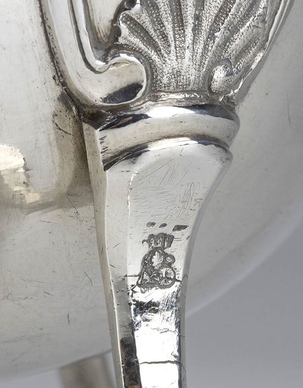 Punzonata con i marchi per l'argento in uso a Saint-Quintin nella giurisdizione di Amien dal 1752 al 1755, con la contromarca in uso dal 1750 al 1766 e con il marchio del mestro argentiere Adrien Dachery (patentato nel 1730) .